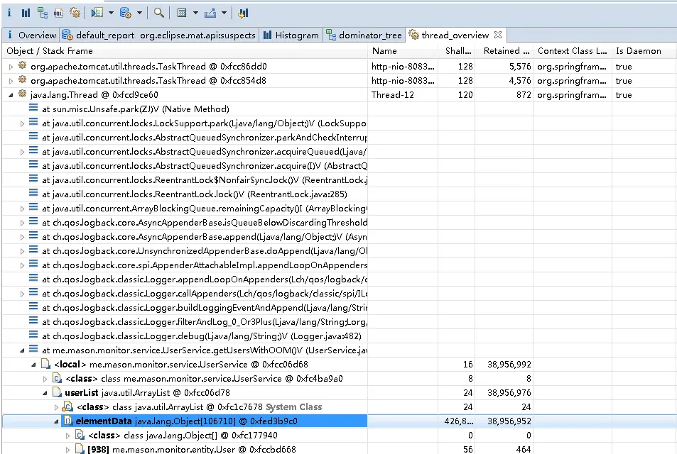 由上图可以看到此线程调用WithOOM方法,使用了变量UserService,而变量使用了userList,它包含了大量的User对象,占用retained heap很大。
