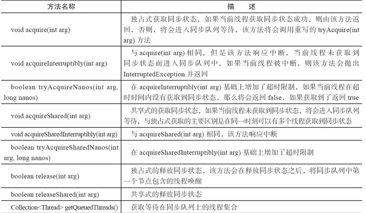 实现自定义同步组件时,将会调用同步器提供的模板方法,这些(部分)模板方法与描述如下