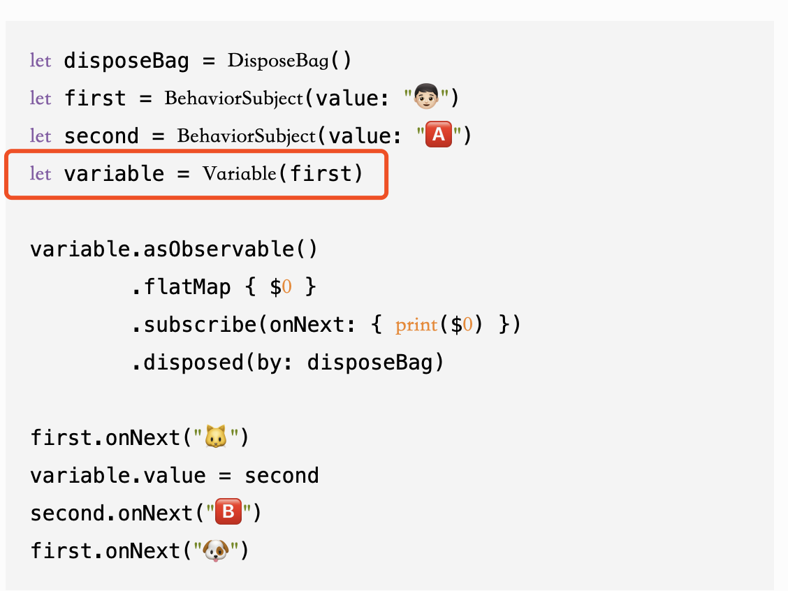 .flatMap {$0} //将Observable的元素转换成其他的Observable",把对 A/B 的观察" 转成 "A/B 观察的字符串"