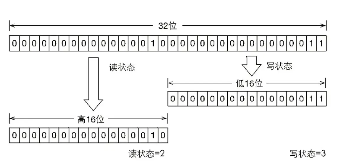 如果在一个整型变量上维护多种状态,就一定需要“按位切割使用”这个变量,读写锁将变量切分成了两个部分,高16位表示读,低16位表示写,划分方式如图5-8所示