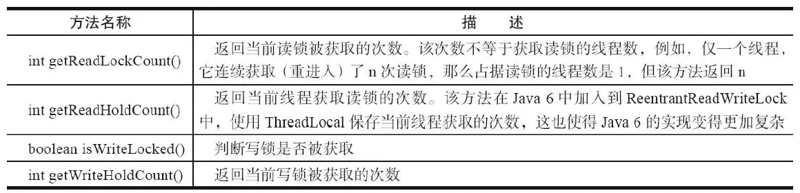 ReadWriteLock仅定义了获取读锁和写锁的两个方法,即readLock()方法和writeLock()方法,而其实现——ReentrantReadWriteLock,除了接口方法之外,还提供了一些便于外界监控其内部工作状态的方法.