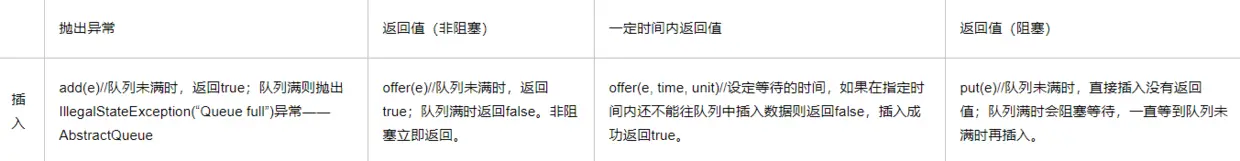 然后我们知道,对于阻塞队列,当入队列时,队列满,等别有四种处理,java在ArrayBlockingQueue类中,针对每种处理分别提供给我们四种方法对应不同的处理: