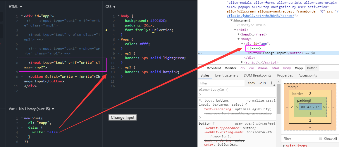 图中可以看到,v-if 表达式为 false,元素渲染出来后是一个注释标签。所以,v-if 指令的本质是根据表达式的值在 DOM 中生成/移除一个元素。