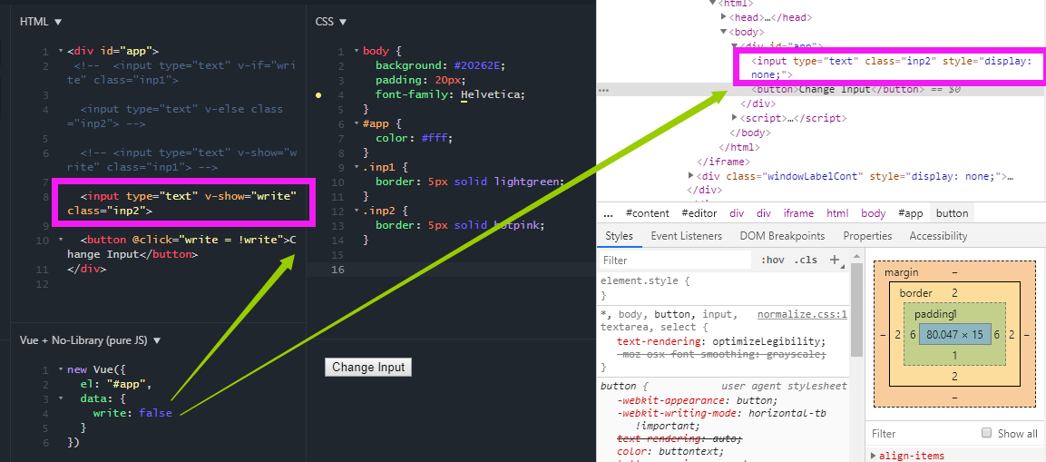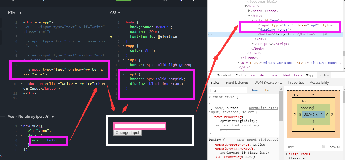图中可以看到,v-show 为 false 时,是借用 css 的 display: none; 属性把指定元素隐藏了。