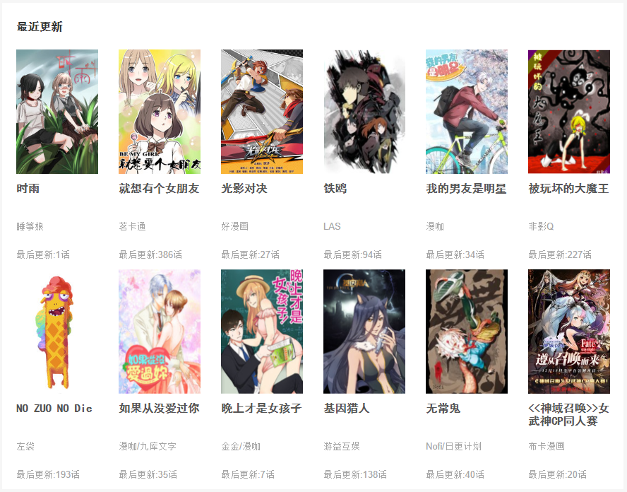 下面的"最近更新"模块也是同样的道理,也是需要发送ajax 请求获取数据来渲染页面,代码如下: