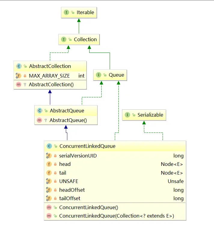 ConcurrentLinkedList是一个基于链接节点的无界线程安全队列,采用的是先进先出的规则,对节点进行排序。当我们添加一个元素的时候,会添加到队列尾部,获取元素时,会返回头部的元素。采用CAS算法来实现。先来看下整体的类图: