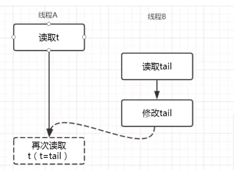 - 多线程入队列 因为入队列,首先需要获取tail节点,然后跟判断tail节点的下一个节点是否为null去做处理,如果下一个节点在还没入队列时,有新的节点插入了,这时候获取到的尾节点为脏数据,需要重新获取尾节点。