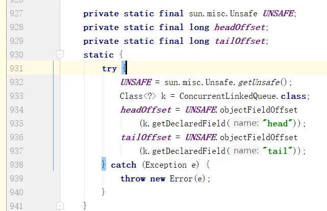 然后来分析下 #多1 这行代码。 p = (t != (t = tail)) ? t : head; 大致可以猜想到应该就是回答一部分线程offer,一部分poll的这种情况。当if (p == q)为true时,说明p指向的节点的next也指向它自己,这种节点称之为哨兵节点,这种节点在队列中存在的价值不大,一般表示为要删除的节点或者是空节点。