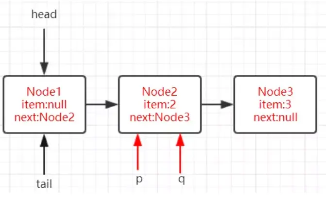 继续看,第三行代码item为null,第4行代码if判断为false,走到第8行代码(q = p.next)if也为false,由于q指向了Node2,在第11行的if判断也为false,因此代码走到了第13行,这个时候p和q共同指向了Node2,也就找到了要删除的真正的队头节点。可以总结出,定位待删除的队头节点的过程为:如果当前节点的数据域为null,很显然该节点不是待删除的节点,就用当前节点的下一个节点去试探。在经过第一次循环后,此时状态图为下图