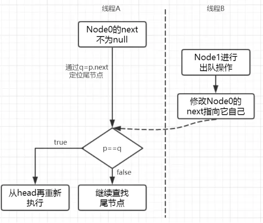 这一部分就是处理多个线程poll的情况,q = p.next也就是说q永远指向的是p的下一个节点,只有p指向的节点在poll的时候转变成了哨兵节点(通过updateHead方法中的h.lazySetNext)。当线程A在判断p==q时,线程B已经将执行完poll方法将p指向的节点转换为哨兵节点并且head指向的节点已经发生了改变,所以就需要从restartFromHead处执行,保证用到的是最新的head。