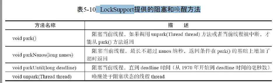 LockSupport定义了一组以park开头的方法用来阻塞当前线程,以及unpark(Thread thread)方法来唤醒一个被阻塞的线程。Park有停车的意思,假设线程为车辆,那么park方法代表着停车,而unpark方法则是指车辆启动离开,这些方法以及描述如表5-10所示:
