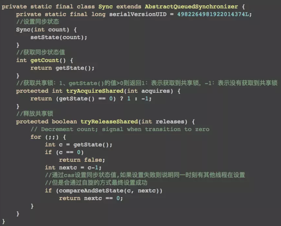 Sync类的源码如下:CountDownLatch的实现依赖于AQS