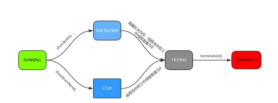 //关闭状态,不再接受新提交的任务,但却可以继续处理阻塞队列中已保存的任务。在线程池处于 RUNNING 状态时,