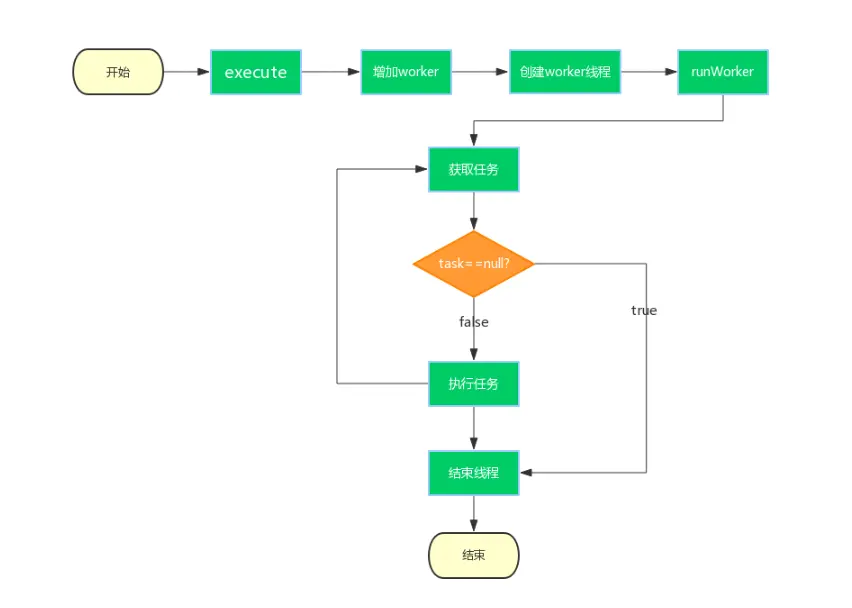 至此,processWorkerExit执行完之后,工作线程被销毁,以上就是整个工作线程的生命周期,从execute方法开始,Worker使用ThreadFactory创建新的工作线程,runWorker通过getTask获取任务,然后执行任务,如果getTask返回null,进入processWorkerExit方法,整个线程结束,如图所示: