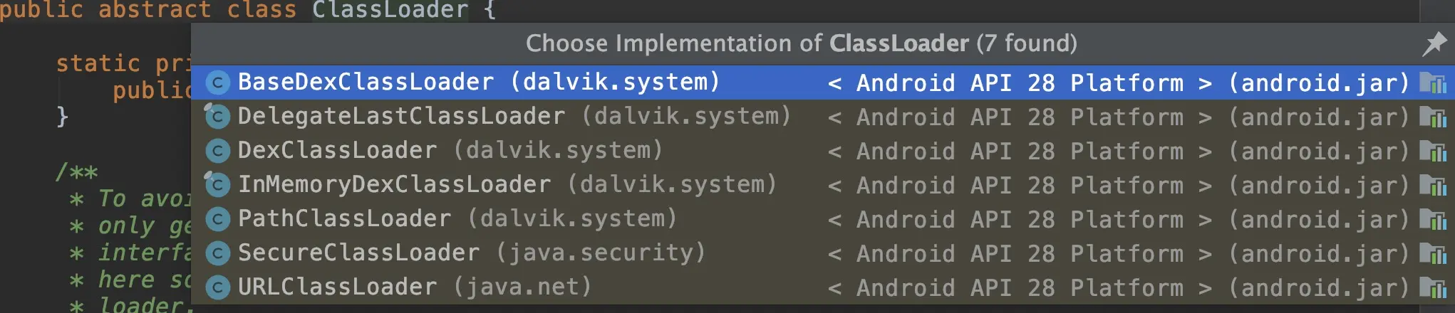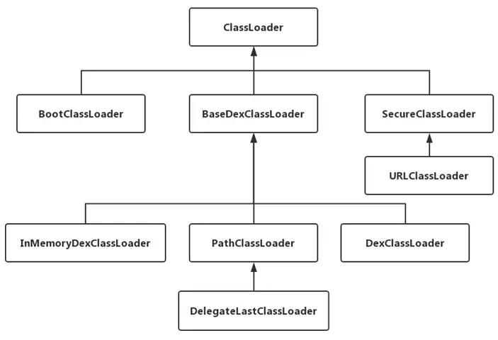 接着看到ClassLoader中的findClass里是直接抛出了一个ClassNotFoundException异常,说明这个方法需要子类来实现。那么接下来就来看看Android中类加载器的实际继承关系。