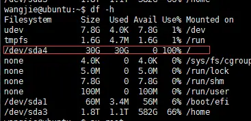 发现/dev/sda4 30G 30G 0 100% / 已经被占满。