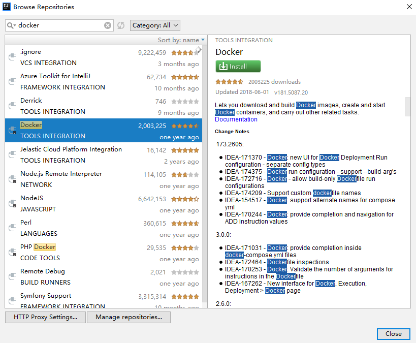IDEA 上的准备工作,主要是安装一个 Docker 插件,点击 File->Settings->Plugins->Browse Repositories 如下: