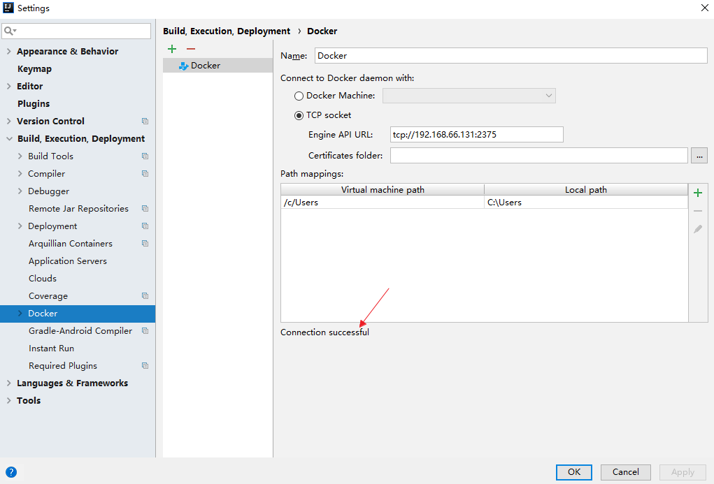 配置一下 Docker 的地址,配置完成后,可以看到下面有一个 Connection successful 提示,这个表示 Docker 已经连接上了。