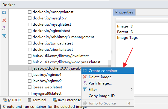 此时,我们选中这个镜像,右键单击,即可基于此镜像创建出一个容器,如下图: