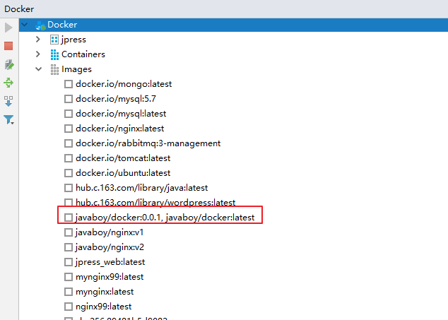 点击左边的绿色启动按钮,连接上 Docker 容器,连接成功之后,我们就可以看到目前 Docker 中的所有容器和镜像了,当然也包括我们刚刚创建的 Docker 镜像,如下:
