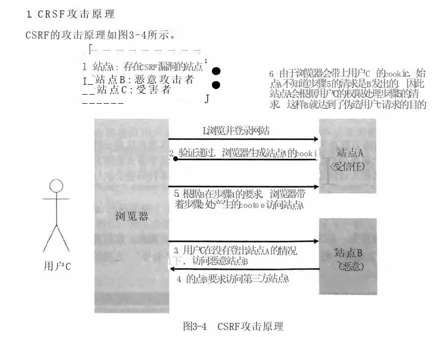 如图,在恶意站点B冒充用户C去请求站点A,就可以做一些发送邮件,短信,支付,消息等操作。 受害者在满足了以下两点,登录站点B,攻击者就能发起CSRF攻击了: • 登录受信任站点A,并在本地生成cookie; • 在不登出站点A(清除站点A的cookie)的情况下,访问恶意站点B