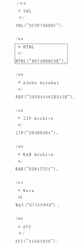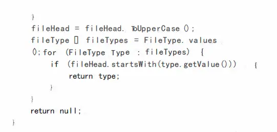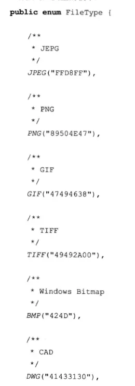 不同类型的文件对应不同的文件头,FileType中包含了常用的文件类型对应的文件头的十六进制编码。 读取文件头,判断文件类型: /** *读取文件头 */ privates七aticString getFileHeader(String filePath) throws IOException //这里需要注意的是,每个文件的魔数的长度都不相同,因此需要使用startwith byte db = new byte [ 2 8 ] ; InputStrearn inputStream = null; inputstream=new FileinputStream(filePath); inputStream.read(b, 0, 28); inputstream.close(); return bytes2hex(b);