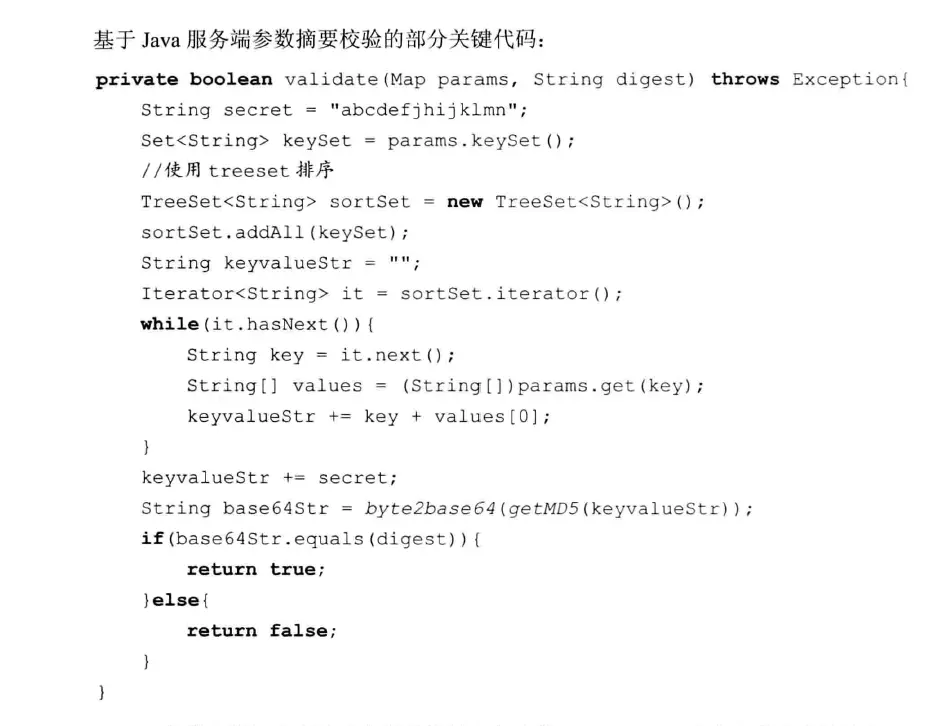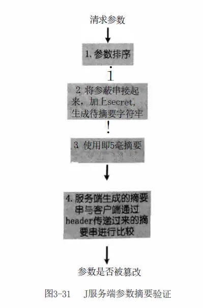 在服务端接收到客户端传递的参数后,服务端会采用与客户端相同的策略对参数进行排序,并且加上相同的secret, 采用相同的摘要方式生成摘要串。由于相同内容经过相同的摘要算法,生成的摘要内容必定是相同的。将服务端生成的摘要串与客户端生成摘要串进行比较,这样可以得知参数内容是否被篡改。