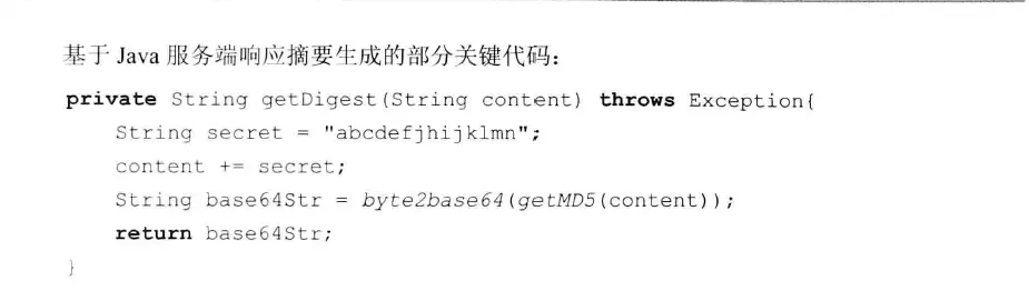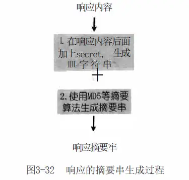 服务端生成响应内容以后,在响应内容的后面加上secret,便是待摘要串,然后使用MD5等摘要算法生成响应的摘要串。