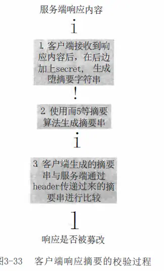 当客户端接收到服务端的响应后,加上相同的secret进行拼接,并采用与服务端相同的摘要算法进行摘要,生成的摘要串与服务端传递过来的摘要串进行比较,这样便可得知服务端的响应是否被篡改。