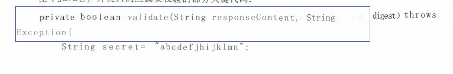 客户端接收到服务端的响应内容后,在响应内容的后面加上secret,便成为待摘要串,然后通过MD5等摘要算法的计算来生成对应的响应摘要,与服务端通过header等方式传递回来的摘要串进行比较,如果一致,表示响应没有被继改,反之则说明参数遭到篡改。