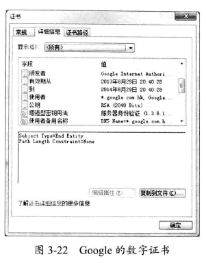 不同的数字证书所包含的内容信息和格式可能不尽相同,因此,需要有一 种格式标准来规范数字证书的存储和校验。大多数的数字证书都以一 种标准的格式 (即 X .509) 来存储它们的信息。X.509提供了一 种标准的方式,将证书信息规范地存储到一 系列可解析的字段当中.X.509 V3是X.509标准目前使用最为广泛的版本。表3-1中介绍了X.509证书中所包含的字段信息。