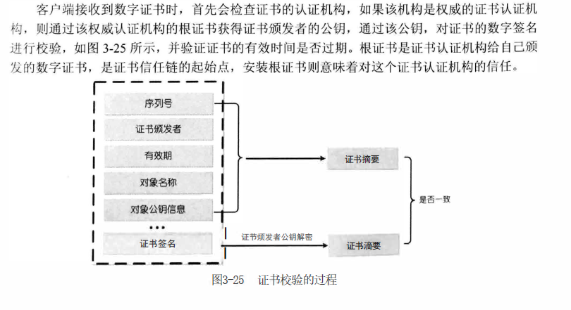 对象的名称指的是证书所代表的用户,可以是人、服务器、组织等。证书的过期时间用来确定证书是否仍然有效。颁发机构将为证书的真实性与有效性做担保,确保证书所携带的信息是经过校验的。数字签名用于鉴别证书的颁发机构,以及证书内容是否完整,颁发机构用私钥对证书进行签名,而校验方使用颁发机构的公钥来解密签名,与其用摘要算法生成的摘要进行比较,便可以验证证书是否由该机构所颁发,信息是否完整。对象的公钥用来对信息进行加密,信息传输到接收方,接收方将使用公钥对应的私钥进行解密。