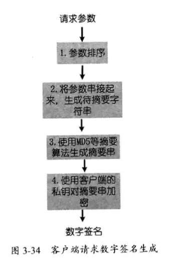 与摘要认证的方式类似,由于传递端和接收端都认为HTTP协议的请求参数是无序的,因此对于签名认证来说,客户端与服务端双方需要约定好参数的排序方式。请求的参数经过排序后,再将参数名称和值经过一定的策略组织起来,这时不再是加上 secret, 而是直接通过约定的摘要算法来生成数字摘要,并且使用客户端私钥对数字摘要进行加密,将加密的密文传递给服务端。