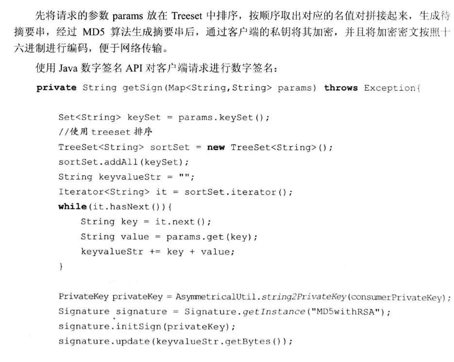 同样的,服务端返回的响应,也需要采用约定好的摘要算法生成相应的摘要,并且使用服务端的私钥进行加密,然后将生成的密文作为响应的一 部分,返回给客户端,以便验证服务端的身份及返回数据的合法性。