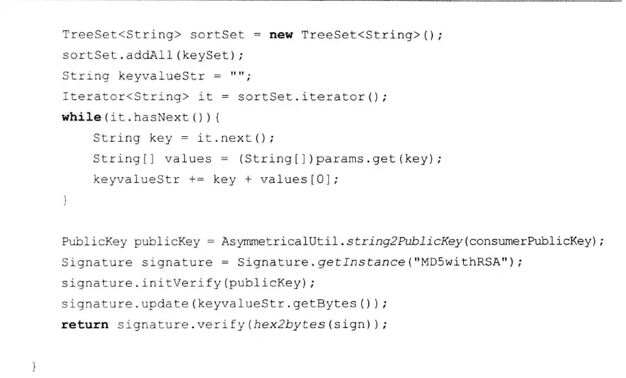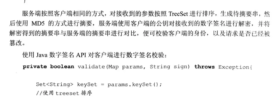 在服务端接收到客户端传递的参数后,服务端会采用与客户端相同的策略对参数进行排序,并使用相同的摘要方式生成摘要串,然后服务端使用客户端的公钥将接收到的密文进行解密,得到客户端生成的摘要串,将服务端生成的摘要串与客户端生成摘要串进行比较。这样便可以得知,参数是否由客户端生成,并且参数的内容是否被篡改。