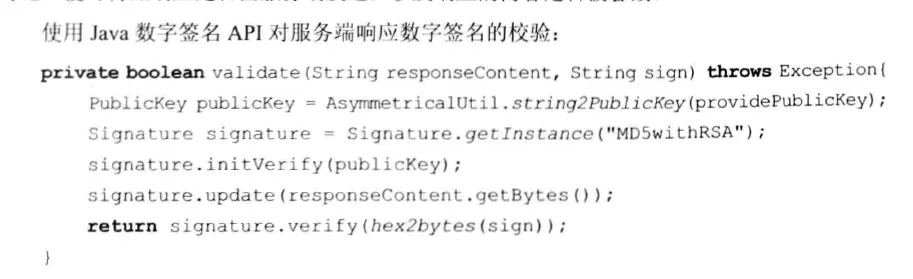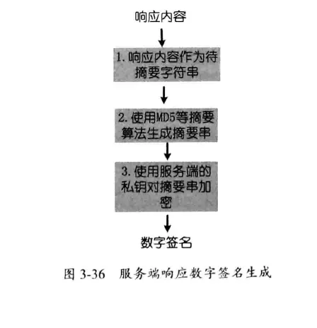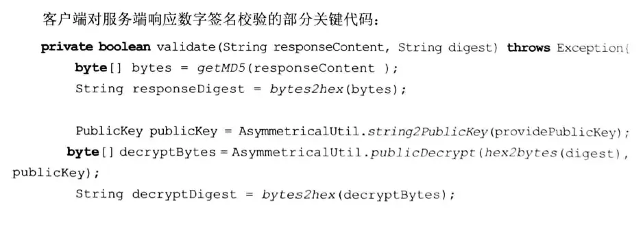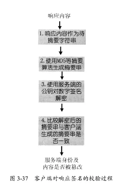 当客户端接收到服务端的响应后,采用与服务端相同的摘要算法进行摘要,生成摘要串,然后使用服务端的公钥解密接收到的签名密文,得到服务端生成的摘要串,此时与客户端生成的摘要串进行比较,便可得知响应是否由服务端发出,以及响应的内容是否被篡改。