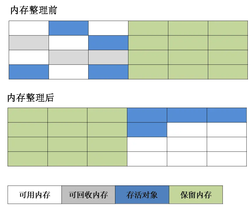 复制算法的缺点使得它只适用于对象存活率较低的新生代。 标记整理算法(Mark-Compact)标记过程仍然与标记清除算法一样,但之后不是直接对可回收对象进行清理,而是让所有存活的对象都向一端移动,再清理掉端边界以外的内存区域。