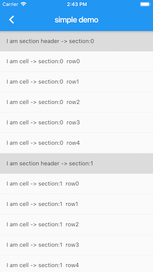 flutter_tableview可以理解成iOS中的UITableView。将数据源拆分成组的概念,每一组都有最多一个 “组的头部”,和若干个cell item。每一组的头部都会悬停在最顶部,下面来看下效果图。