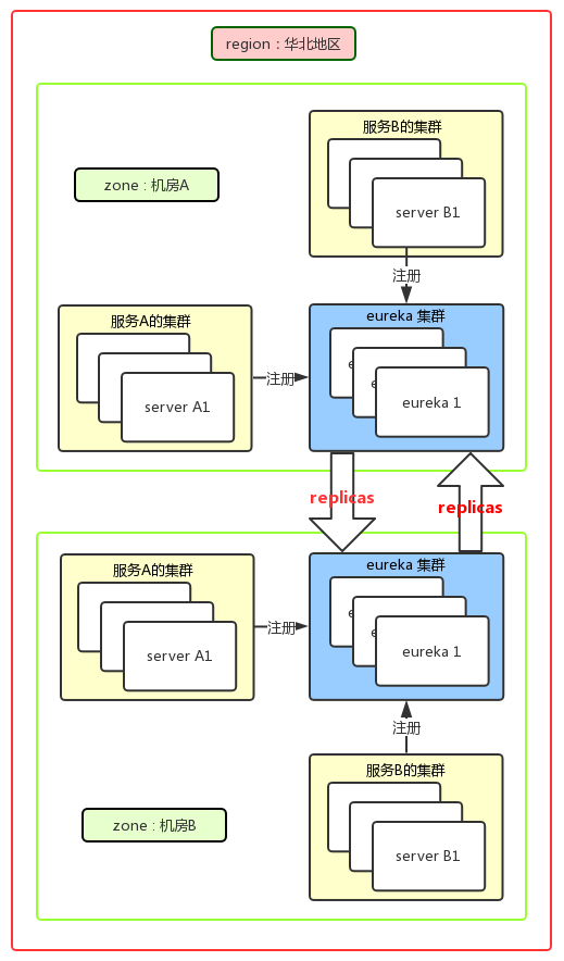 每个机房内有一个 Eureka Server 集群 和两个服务提供者 ServiceA 和 ServerB
