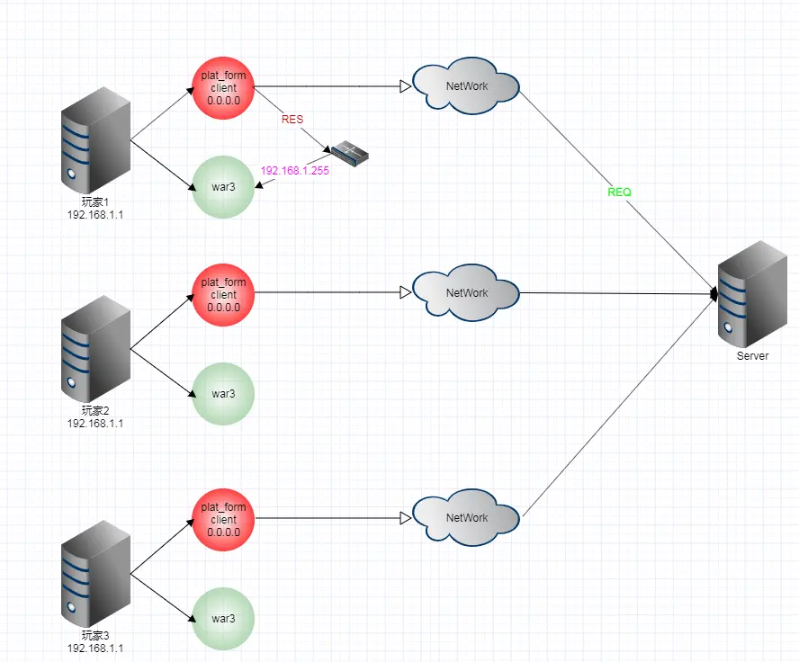 用户游戏war3 是一个进程 plat_form_client 也是一个进程 平台客户端ip地址以0.0.0.0 网络地址启动 将接收到局域网中的所有帧
