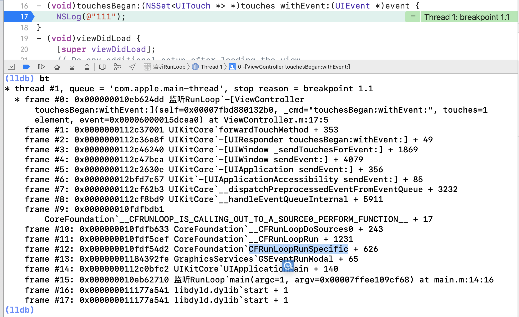 通过在打印调用栈 找到CFRunLoopRunSpecific