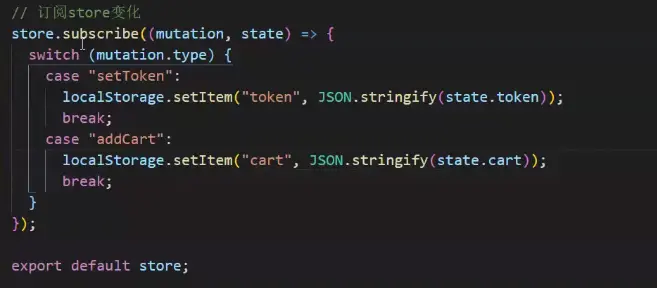 vuex中数据变化对mutations的监听 聆枫Pursue 2019-08-30 571 阅读1分钟 现在实现如果mutations 里的对象发生改变则我就将他存到缓存中,将store提取出来,进行订阅store变化,回调函数存在mutations 存在变化的对象type类型(setToken,addCart)