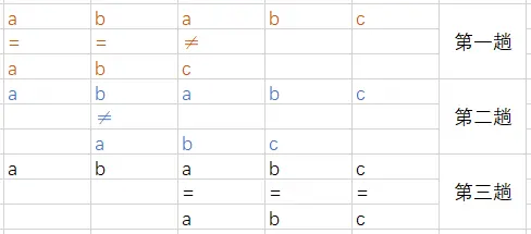 我们可以看到,其实在b不匹配时完全可以直接跳到 j=-1 ,而不用从j=4,j=3...j=-1,因为这些位置上对应的字符都是a,完全只需要比较1次就足够了。这就是KMP算法改进的关键点。