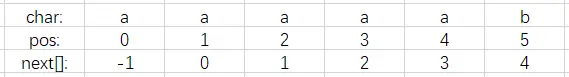 上面我提到如果模式串几乎没有重复项的话,算法会退化。但是模式串中重复项过多的话,也是存在一些问题的。我们举个极端的例子来说明,比如对于模式串aaaaab,它的next数组如下: