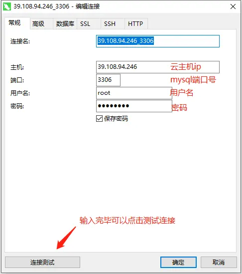 - 以Windows为例,使用navicat输入云主机ip地址、端口、登录名和密码