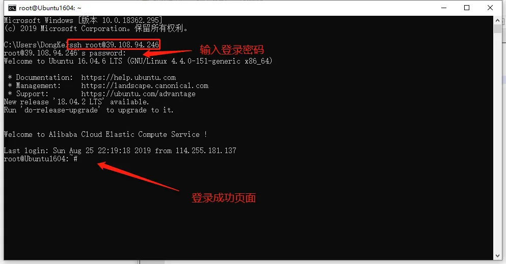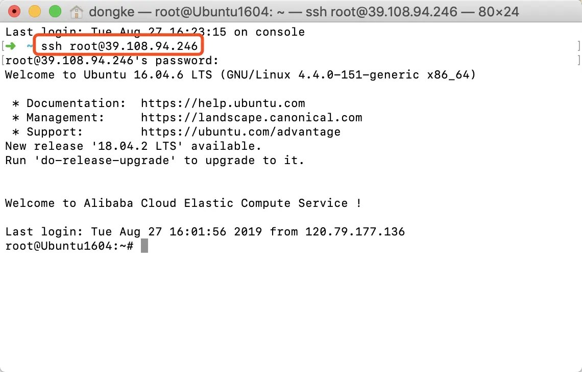 ssh root@39.108.94.246 // 如果ip正确,会提示输入密码