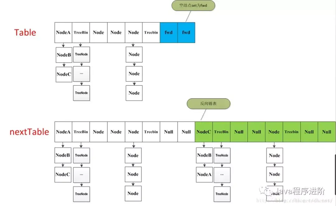 ForwardingNode(采用Unsafe.compareAndSwapObject方法实现),这个是触发并发扩容的关键如果f为链表的头节点(fh >= 0),则先构造一个反序链表,然后把他们分别放在nextTable的i和i + n位置,并将