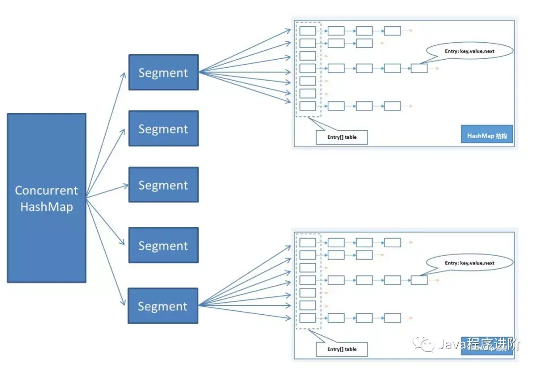 jdk1.7中采用Segment + HashEntry的方式进行实现,结构如下: