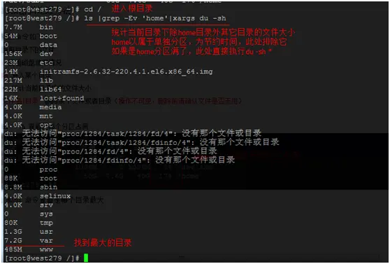 ll #列出当前目录下的文件 df –vh #查看磁盘使用情况 cd 目录名 #进入某个目录 du -sh * #统计当前目录内的文件大小 rm -rf 文件名|目录 #删除某个文件或者目录(操作不可逆,删除前请确认文件是否无用) ls | grep -Ev 'home'|xargs du -sh #统计除home目录外其它目录文件大小