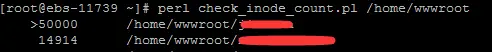 继续执行等于50000的目录,如果没有就是最大值目录占用高。 比如perl check_inode_counts.pl /统计到/home目录等于50000,继续执行perl check_inode_counts.pl /home,一层目录一层目录的执行找到最大占用,如图wget http://downinfo.myhostadmin.net/check_inode_counts.txt mv check_inode_counts.txt check_inode_counts.pl perl check_inode_counts.pl / - 继续查找,直到找到占用inode对应较大目录,注意一般都是多个目录。